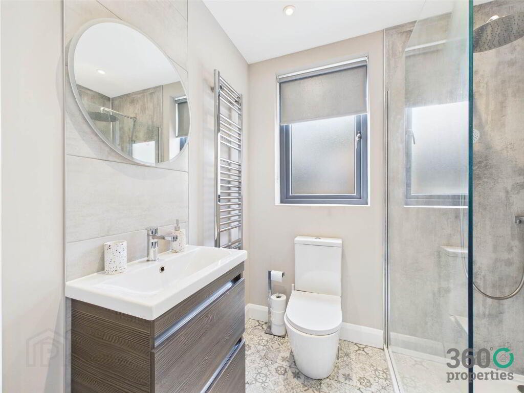 En-suite: 6`9`` x 5`6`` Three piece suite comprising of low flush w/c, vanity wash hand basin and mains shower. Towel radiator. Partly tiled walls and tile floor.