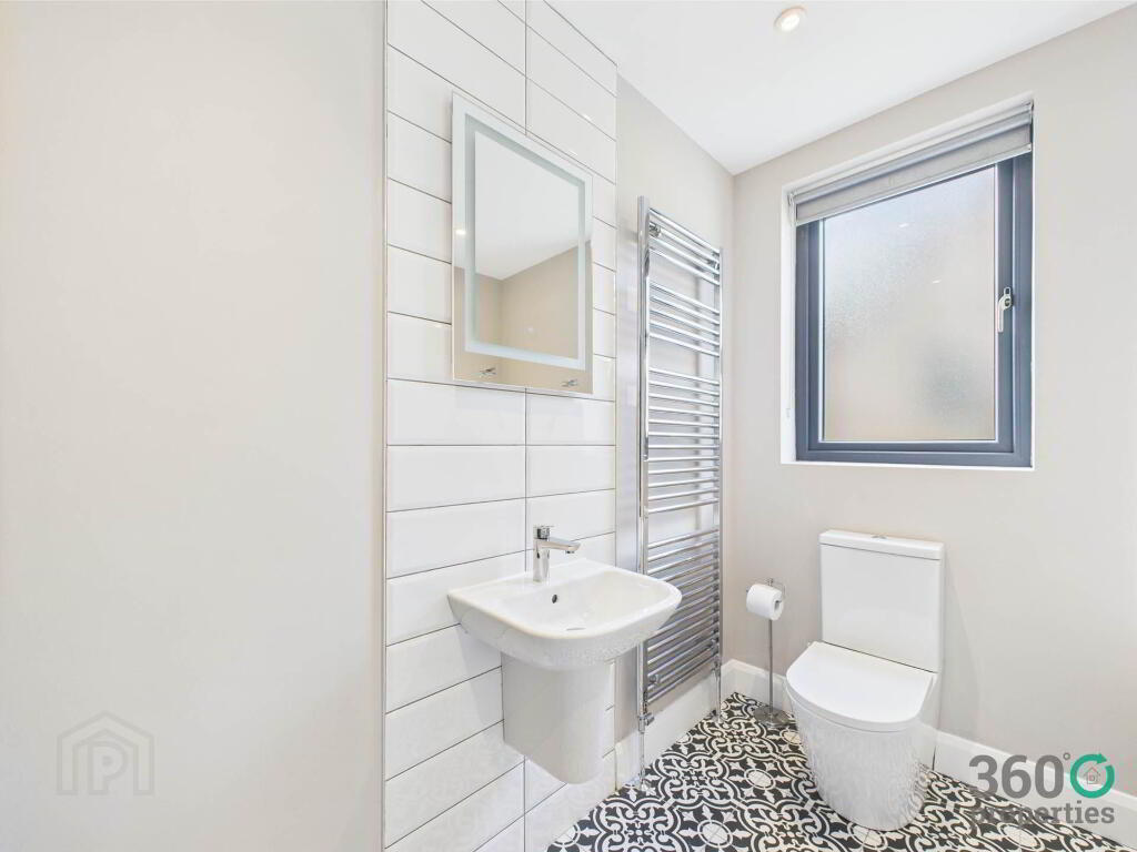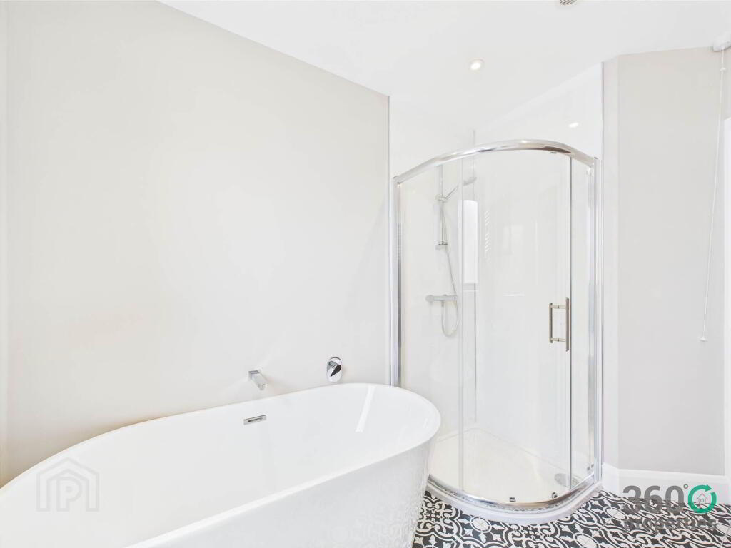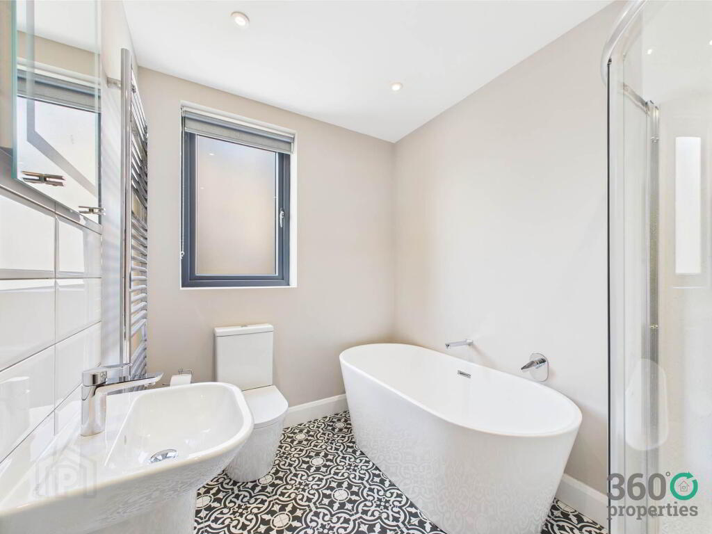 Bathroom: 8`8`` x 6`6`` Four piece suite comprising of low flush w/c, floating wash hand basin, free standing bath and mains shower with rain head. Towel radiator. Partly tiled walls and floor.