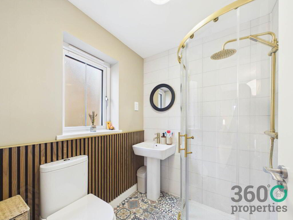 En-suite: 5`9`` x 5`85 Low flush w/c, pedestal wash hand basin and mains shower. Feature panelling. Partly tiled walls and mosaic tile floor.
