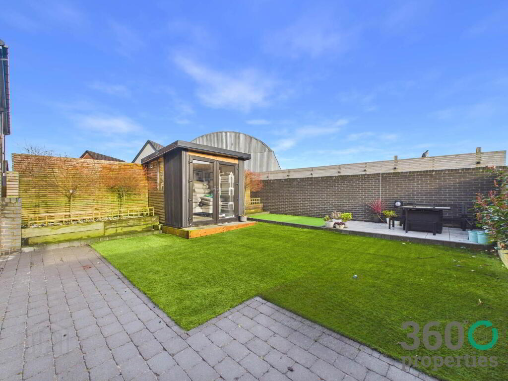 Rear: Fully enclosed bound by wall and fence. Mix of artificial grass, brick pavia and raised paving area. Small putting green. Garden room.